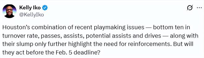 值得一提的是,火箭隊管理層并未像前幾個賽季那樣,釋放出積極補強陣容的信號,反而認為球隊目前的低迷是可控的,選擇按兵不動。