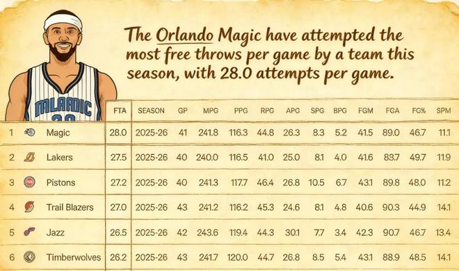 魔術(shù)場均罰球聯(lián)盟最多,是因?yàn)樗麄兊膬?nèi)線優(yōu)勢,瓦格納和班切羅都有出色的低位進(jìn)攻技術(shù);湖人罰球多,是因?yàn)闁|契奇、里夫斯、詹姆斯出色的造犯規(guī)能力;活塞是因?yàn)榭矊幇?、杜倫領(lǐng)銜的青年軍在前場的超強(qiáng)沖擊力。