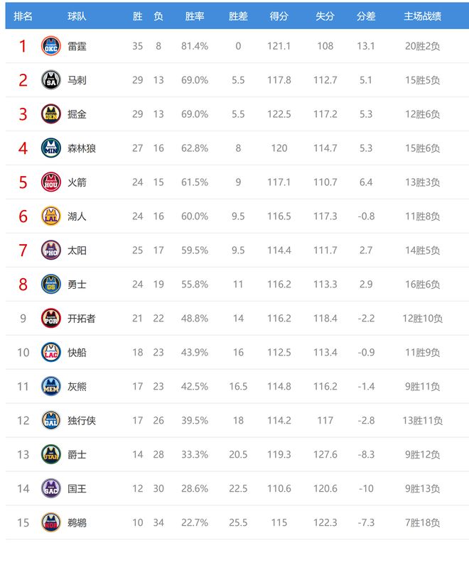 今日比賽后西部排名沒有變化,但球隊(duì)間的勝場差有所改變。