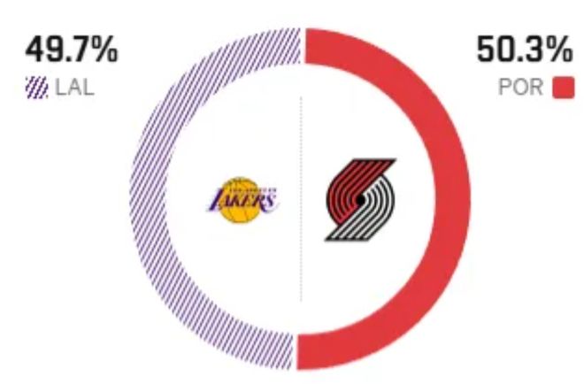 這是兩隊本賽季的第三次交鋒,前兩次交手,湖人開拓者各贏一場,算是旗鼓相當。賽前,美媒ESPN對本場比賽進行了勝率預測,湖人隊勝率僅有49.7%,開拓者勝率則為50.3% ,也算是半斤八兩。