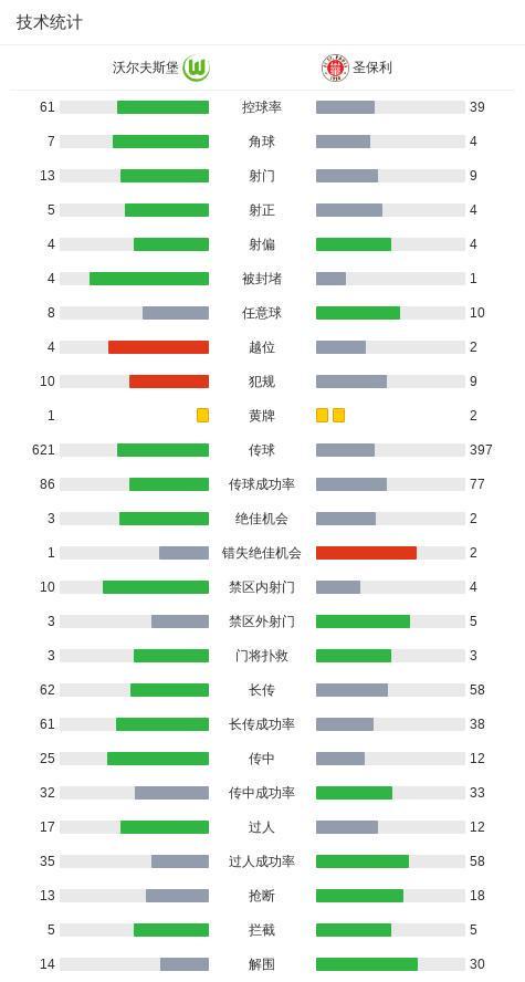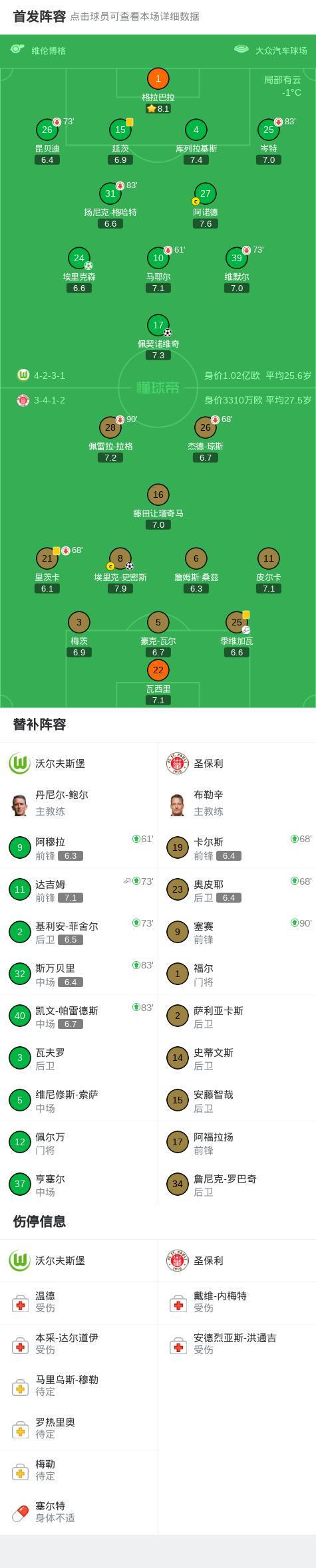 - 沃爾夫斯堡2-1圣保利,佩契諾維奇破門,埃里克森點射