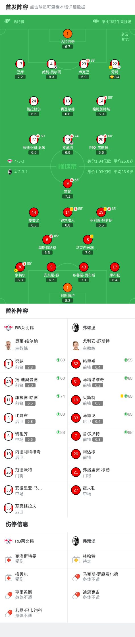- 萊比錫2-0弗賴堡,奧爾班、羅慕洛均頭球破門,勞姆獻(xiàn)助攻