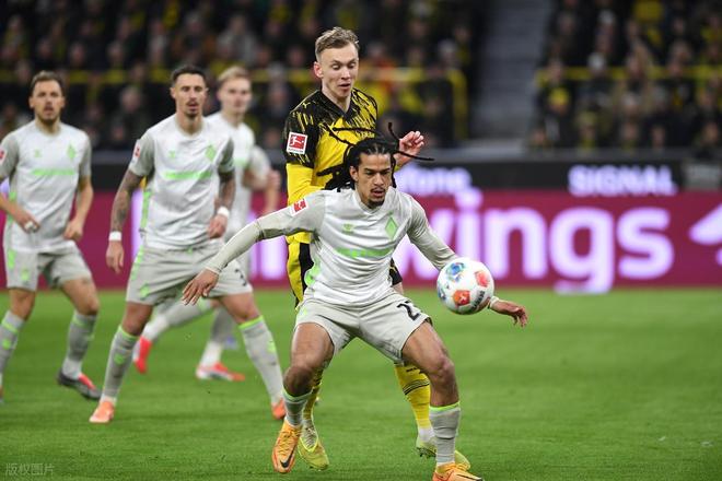 第25分鐘,多特后場又出現(xiàn)失誤,只不過不來梅還是無力把握機會,菅原由勢橫傳將球傳到了多特防守球員腳下。易邊再戰(zhàn)多特還是占據(jù)場上優(yōu)勢,第54分鐘,多特后場反擊,席爾瓦中線處接球,連續(xù)擺脫3人防守帶球往前推進到禁區(qū)弧頂前斜塞右側(cè),拜爾跟進突入禁區(qū)獲得小角度不錯的機會,只是他抽射打的有些正,被門將巴克豪斯奮力撲出。第65分鐘,多特左路壓上,雷爾森帶球斜切突入禁區(qū)橫傳,拜爾策應背身回做,薩比策迎球右腳大力抽射,皮球稍稍高出橫梁。