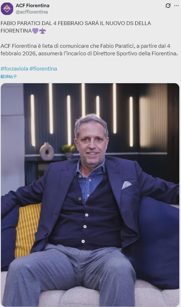 官方:佛羅倫薩宣布從熱刺挖來了帕拉蒂奇,意大利人將從2月4日起出任紫百合的足球主管。