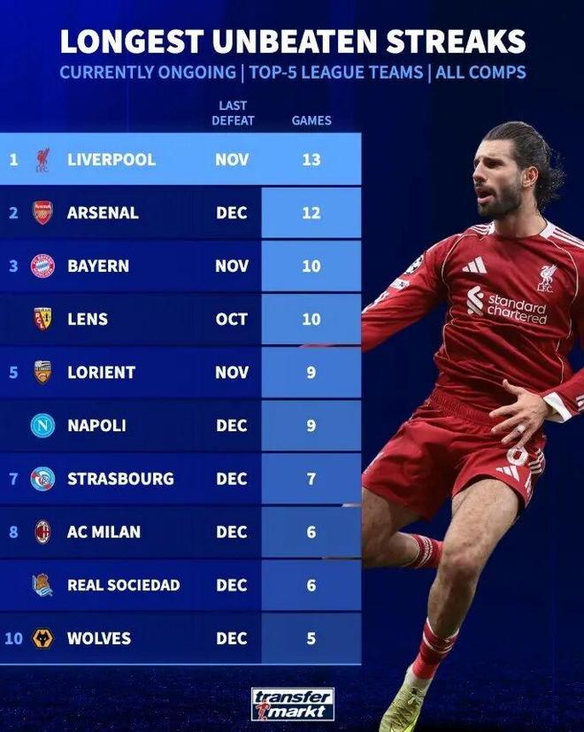 - 五大聯(lián)賽球隊目前最長不敗排行:利物浦13場居首,阿森納第二