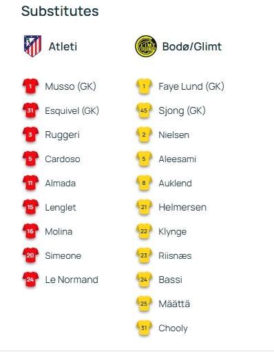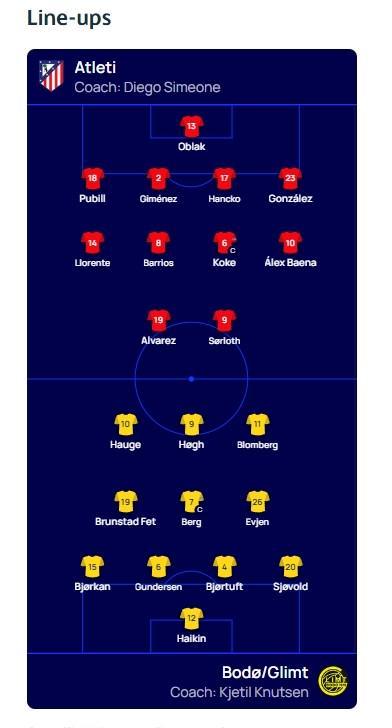北京時(shí)間1月29日04:00,歐冠 聯(lián)賽階段第8輪,馬德里競(jìng)技主場(chǎng)迎戰(zhàn)博德閃耀,賽前雙方球隊(duì)首發(fā)名單公布如下: